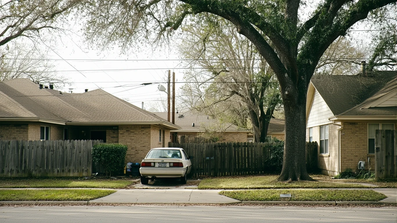 A quiet residential street corner in Alamo Heights, Texas with modest older homes, patchy lawns, a parked car, and visible power lines.