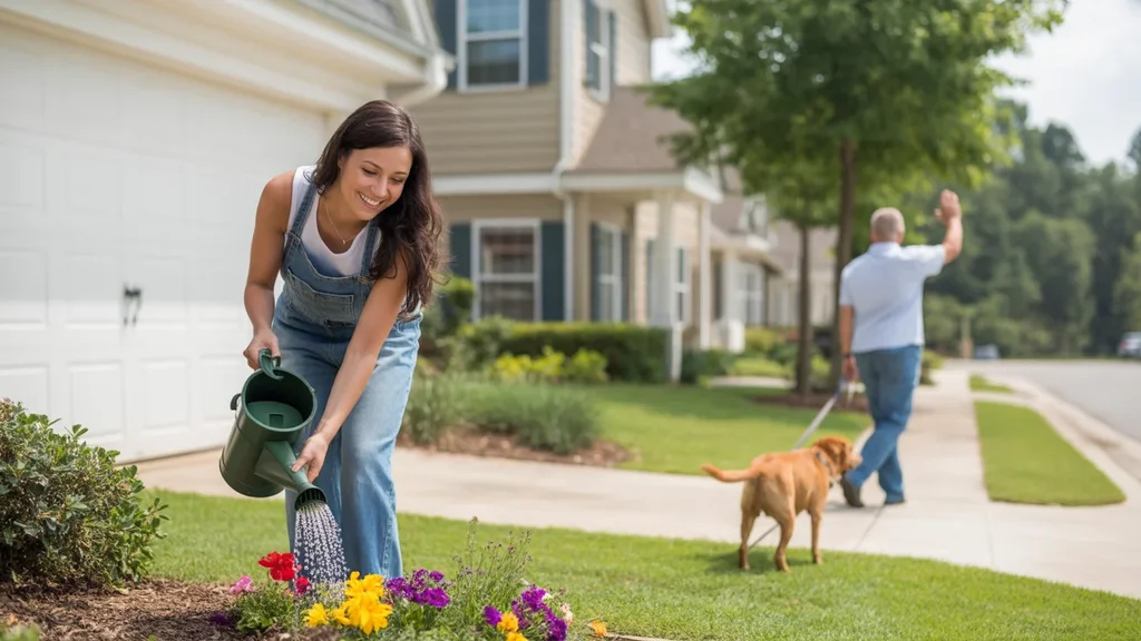 Woman watering flowers outside her townhome in an Alpharetta HOA neighborhood