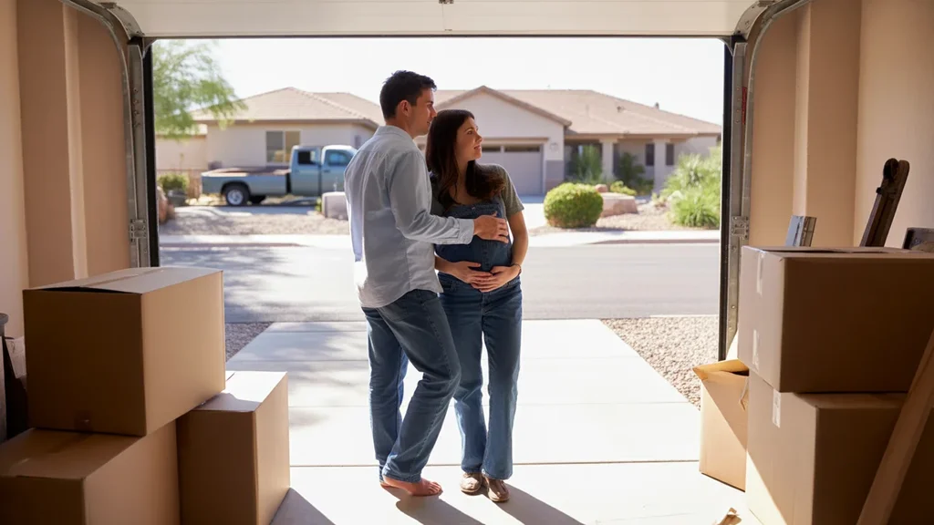 Pregnant couple looks out from garage of new home in Apache Junction Arizona neighborhood