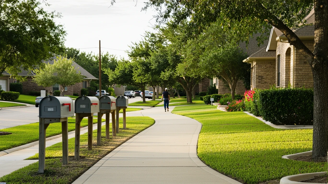 Mailboxes line a quiet sidewalk in a tree-shaded Austin neighborhood.