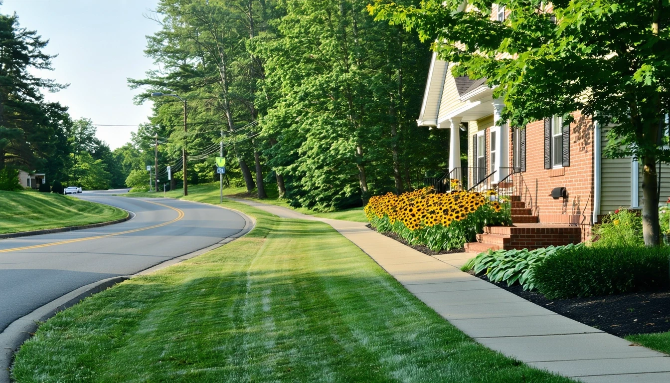 A tidy suburban cul-de-sac in Avon, Connecticut with traditional homes, manicured lawns and native landscaping on a sunny summer morning.