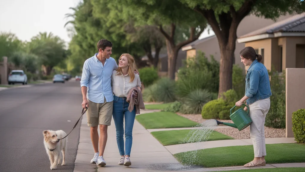 An evening dog walk captures the peaceful, neighborly vibe in an Avondale suburb.