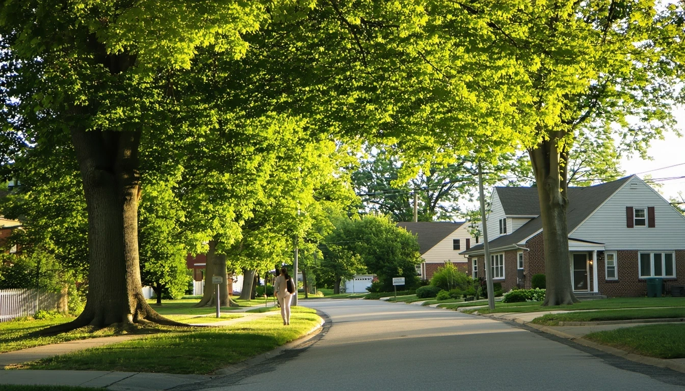 Tree-lined sidewalk curving through a quiet Belleville, Illinois residential street in spring.
