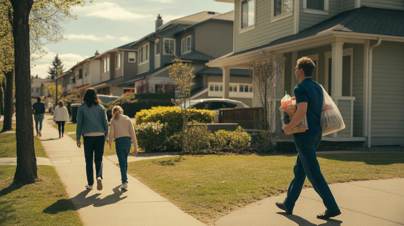 A family walks along a sidewalk in a quiet Bellevue neighborhood on a sunny day. A man carries groceries up the driveway of a craftsman style home.