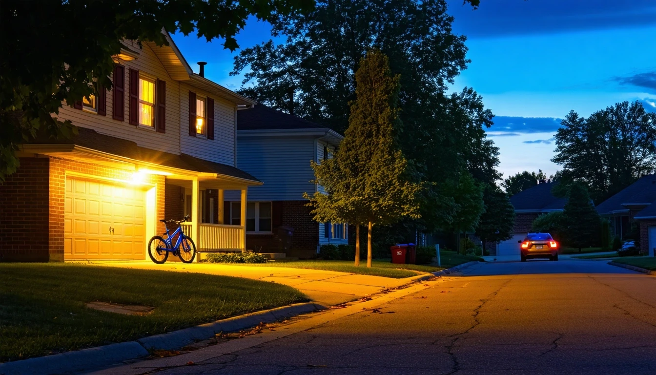 A quiet cul-de-sac in Bloomfield Township, MI at dusk with porch lights on and a child's bicycle near the curb.