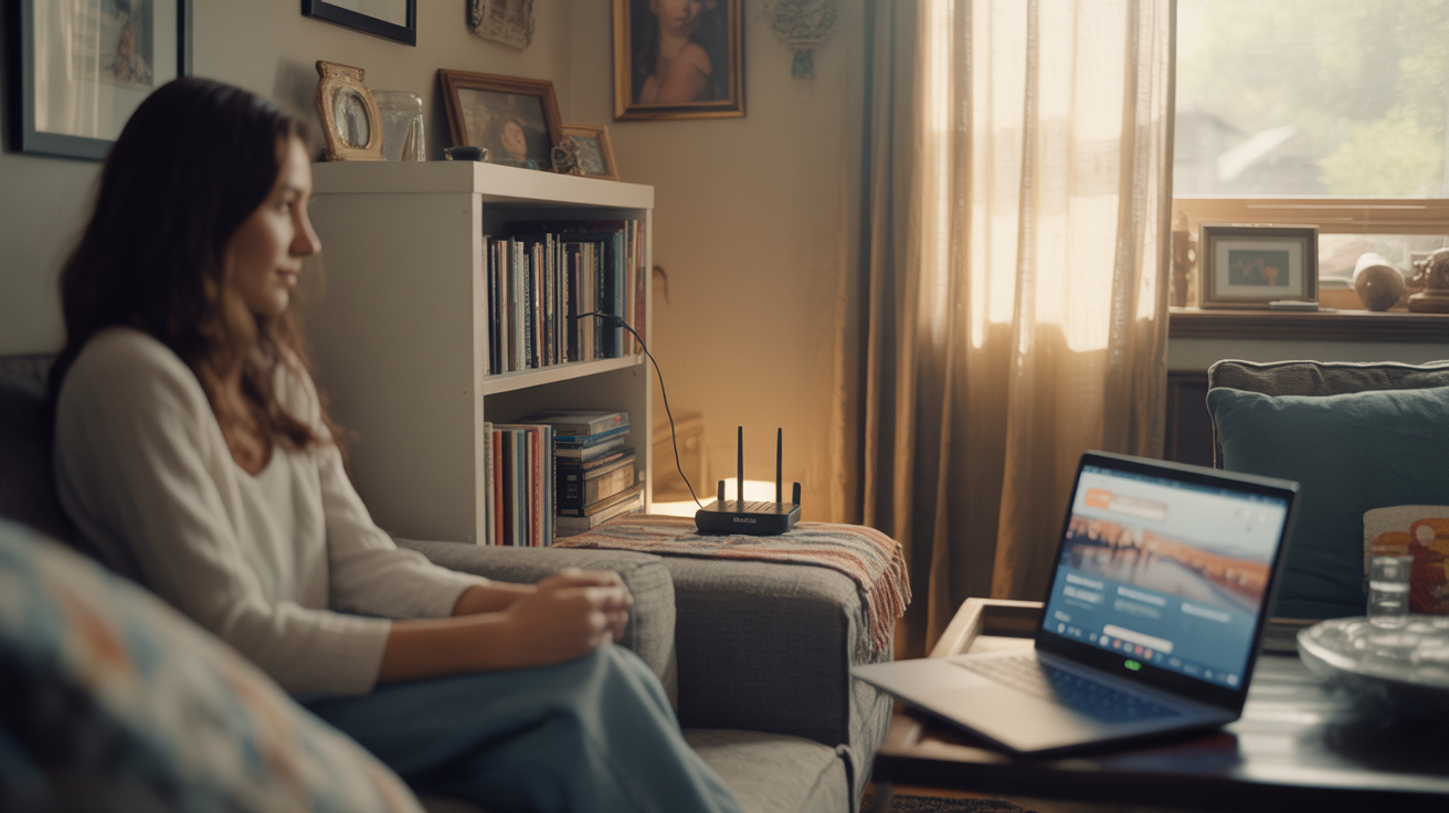 A Wi-Fi router tucked into a bookshelf in a cozy Boulder City living room, with a laptop open to a streaming service homepage on the coffee table.