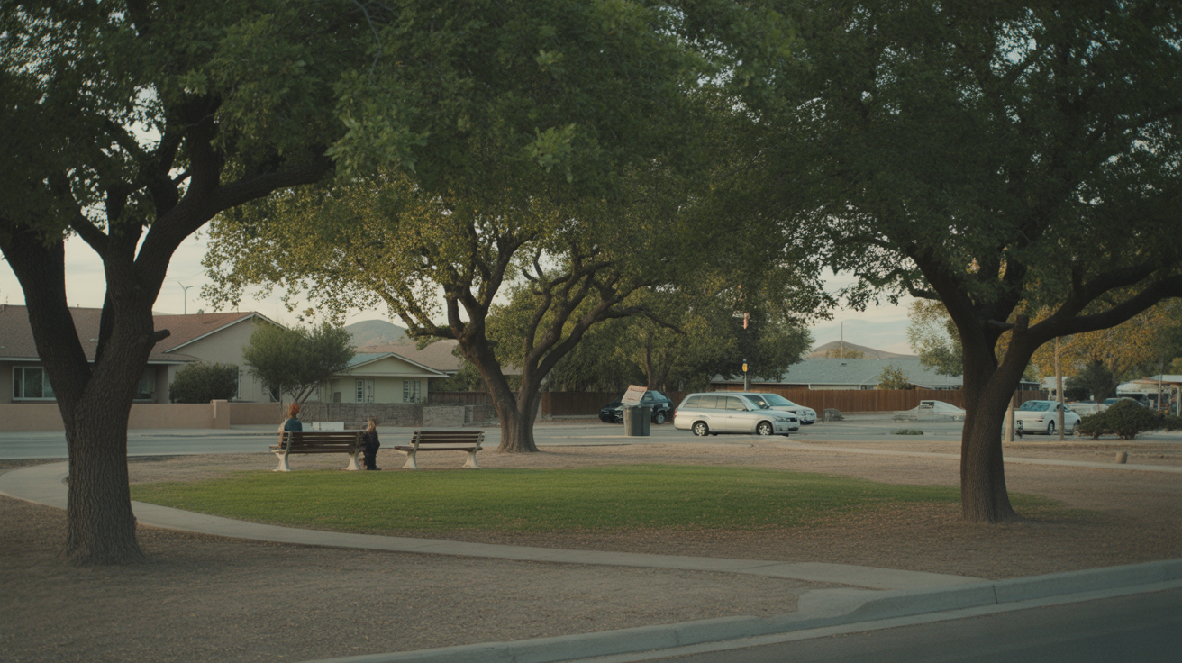 A serene neighborhood park in Boulder City, NV with empty benches under an oak tree and golden-hour light on the grass.