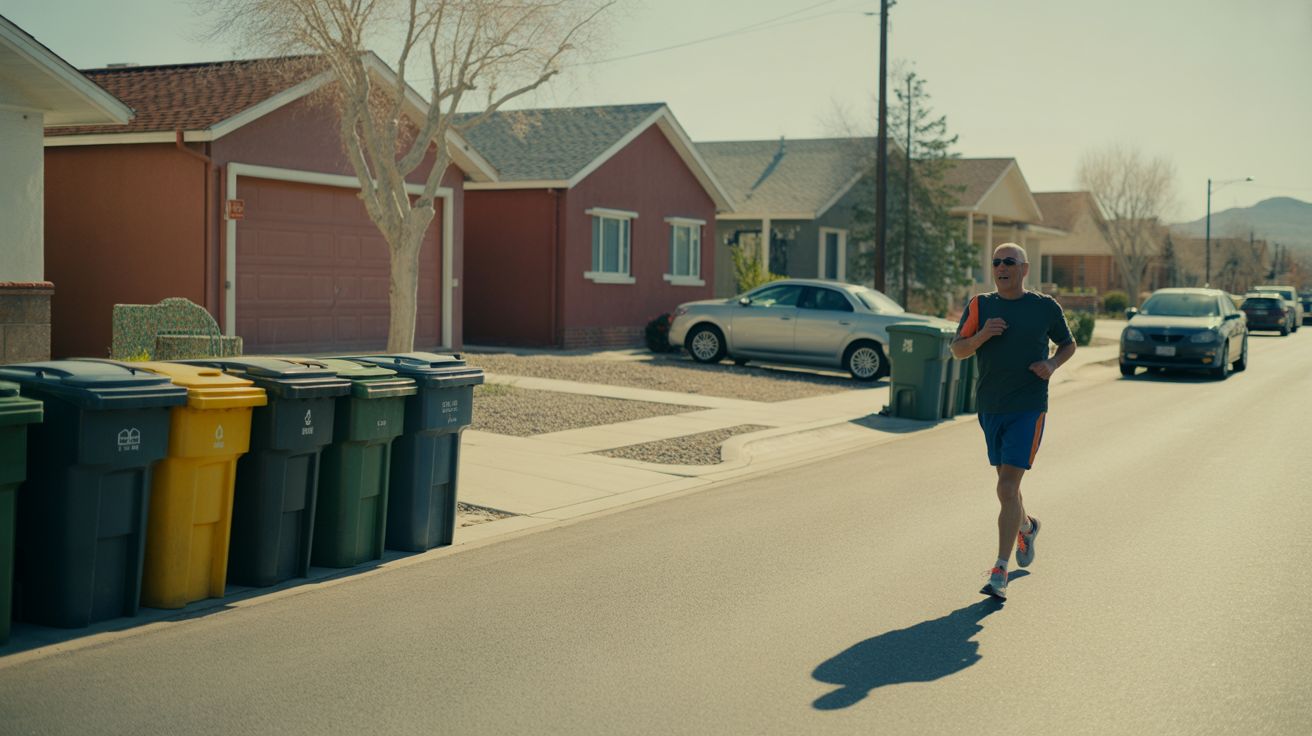 A man jogging past red-brick houses with trash bins lined up along the curb on a quiet morning in Boulder City, Nevada.