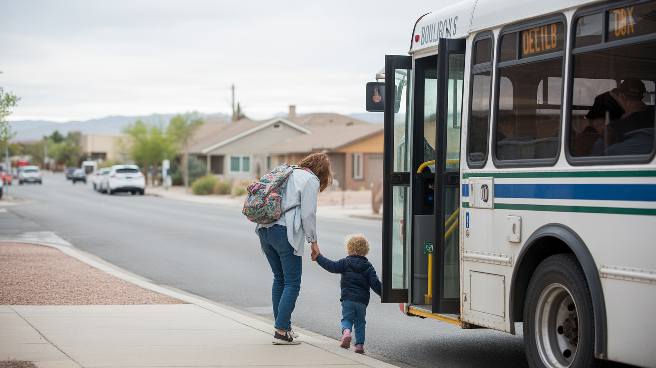 A parent and child boarding a public bus together on a suburban street corner in Boulder City, Nevada.