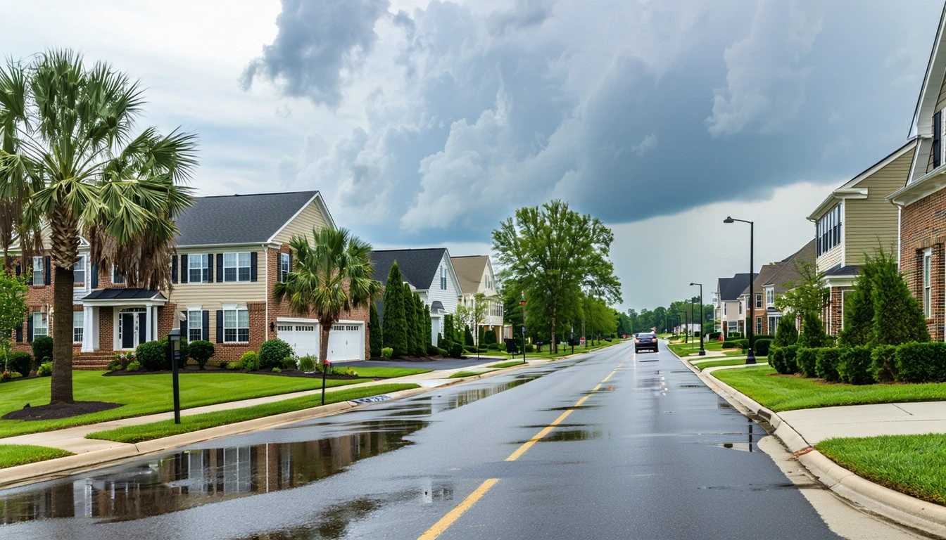 A suburban street in Bowie, Maryland after a rain shower, with wet asphalt, palm tree reflections in puddles, and well-kept homes visible.