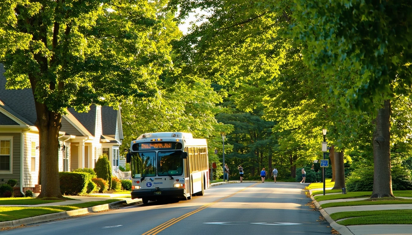 A city bus driving past single-family homes on a tree-lined street in Bowie, Maryland.