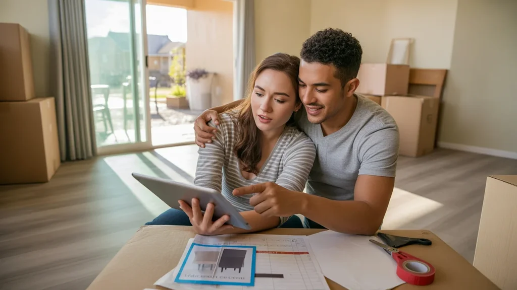 Couple budgeting in new unfurnished Brandon FL home