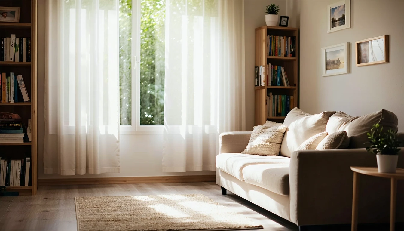 Sunlit living room in Brandon home with couch, bookshelf, and sheer curtains