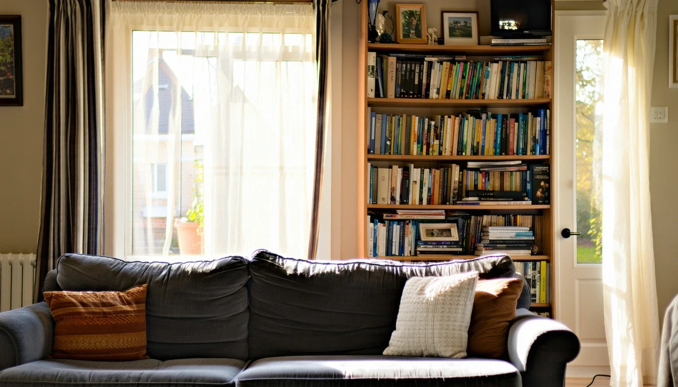 A living room with a couch and bookshelf, illuminated by natural light from a large window. Outside, a peaceful residential street in Bristol, Connecticut is visible.