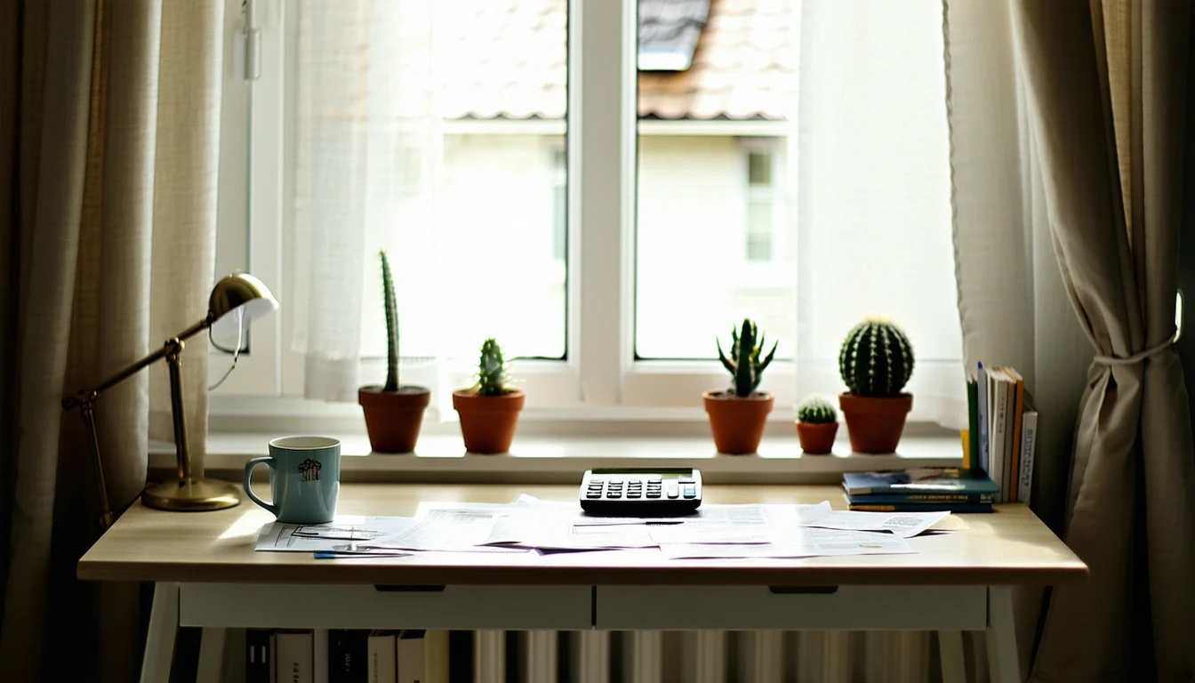 A tidy home office desk by a window with bills, a calculator, and coffee mug.