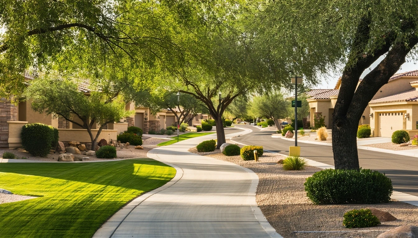 Winding sidewalk under trees with low-rise homes in Buckeye, Arizona