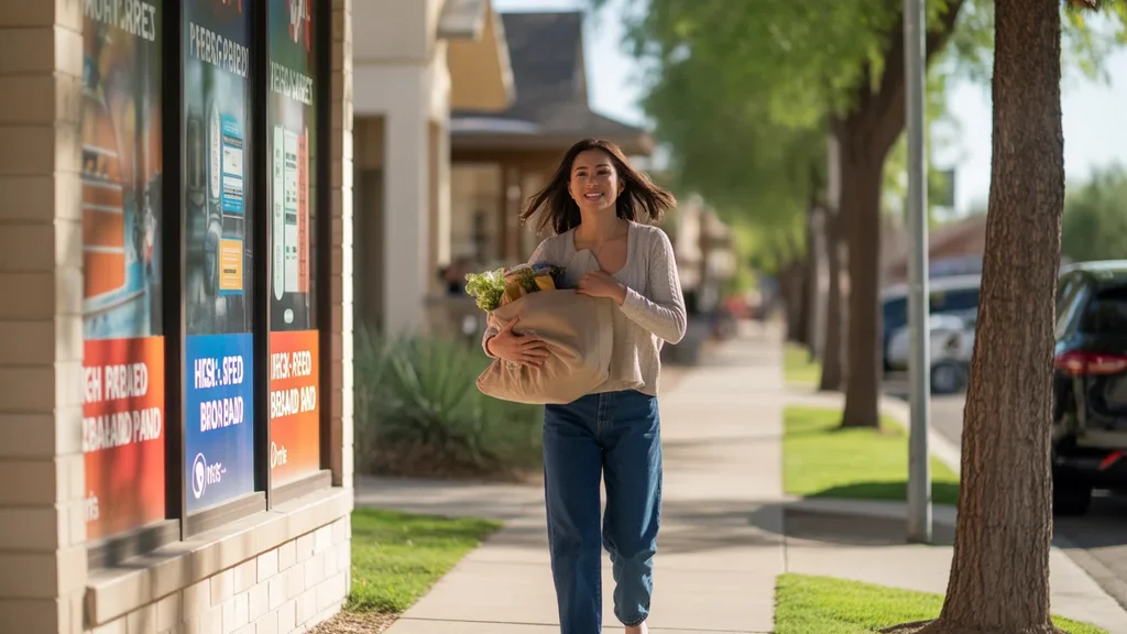 Woman walking past colorful internet provider storefront in Buckeye, Arizona suburb