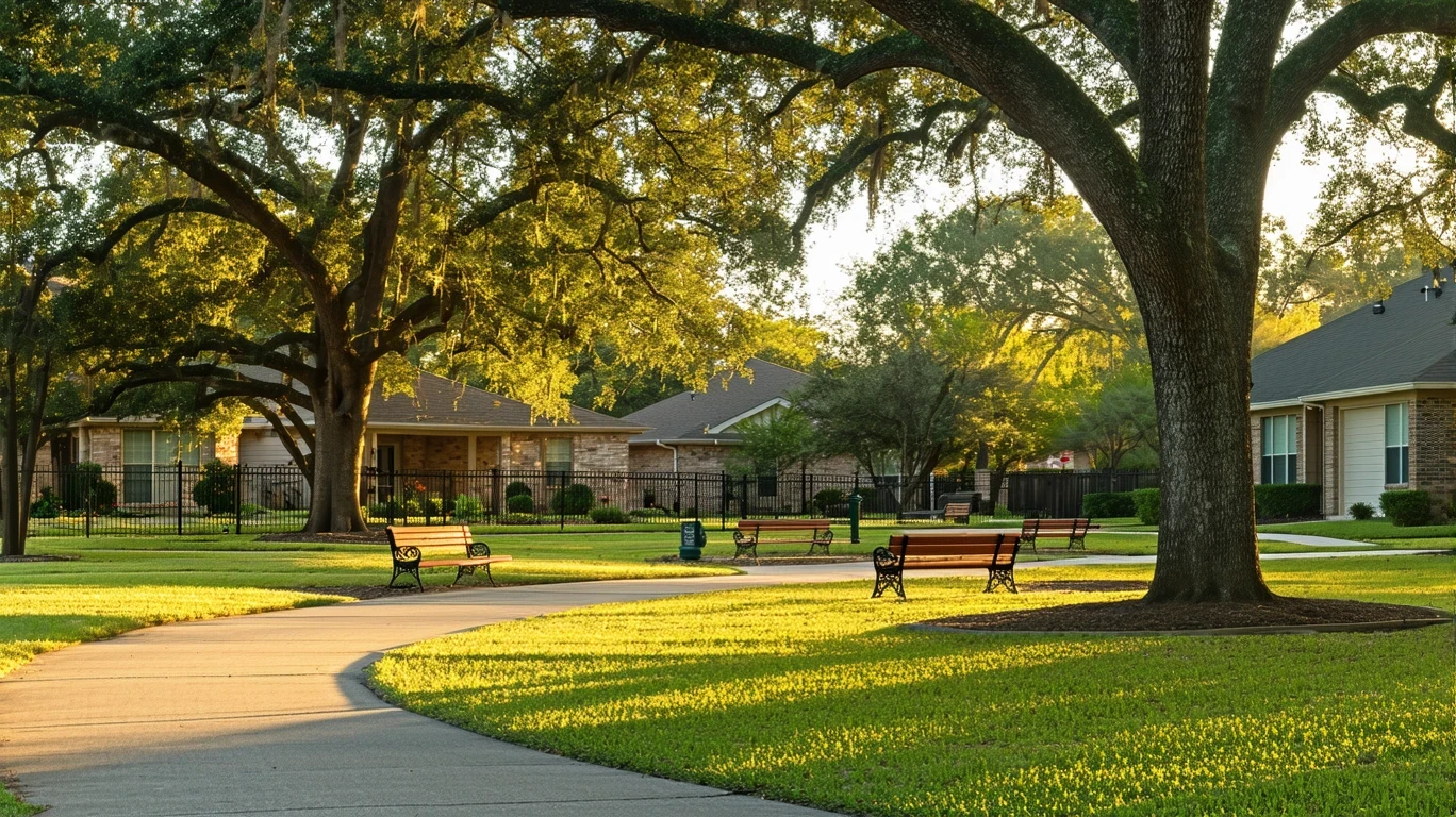 A tranquil neighborhood park in Buda, Texas with empty benches beneath old oak trees and golden afternoon light.