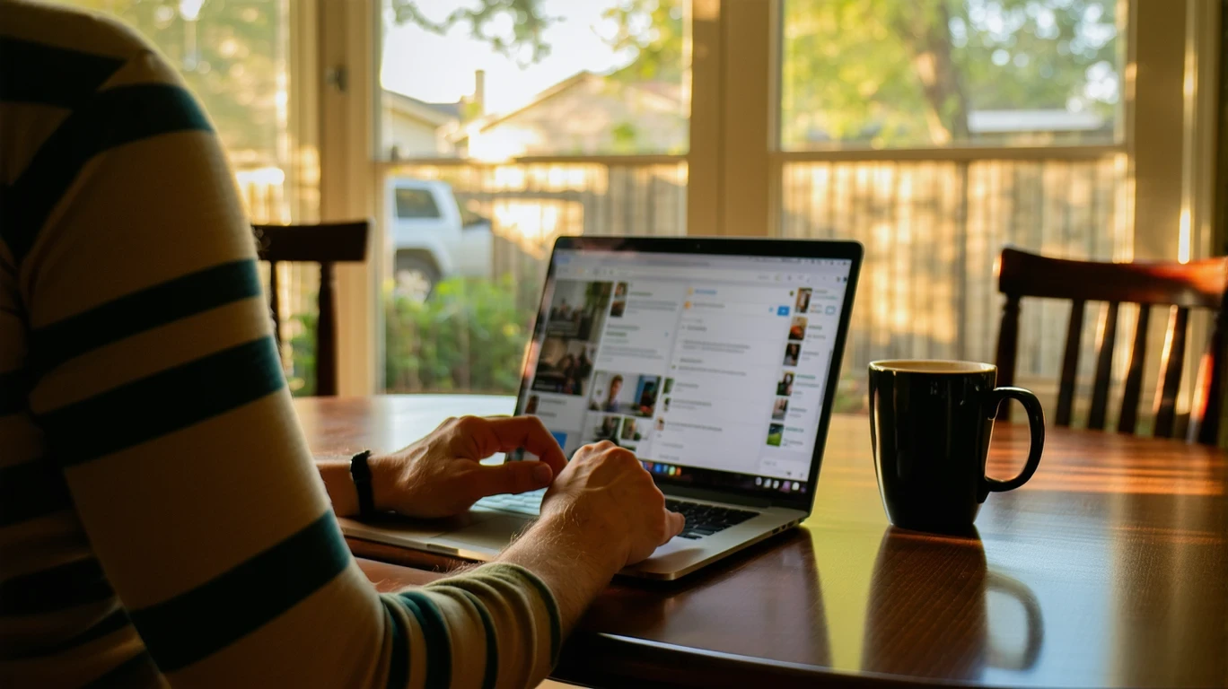 Person looking at streaming options on laptop in kitchen, with coffee mug on table.