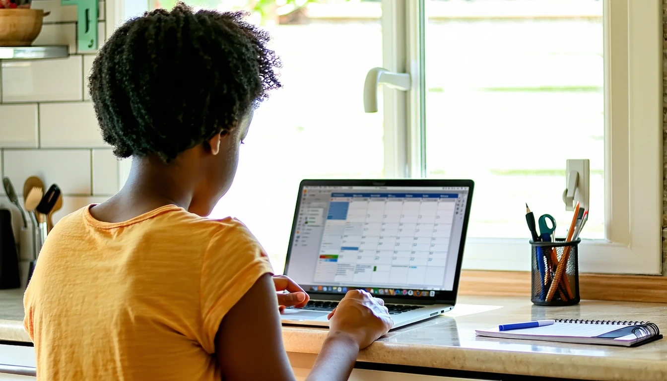 A single parent reviews their monthly budget on a laptop in a clean, sunlit kitchen.