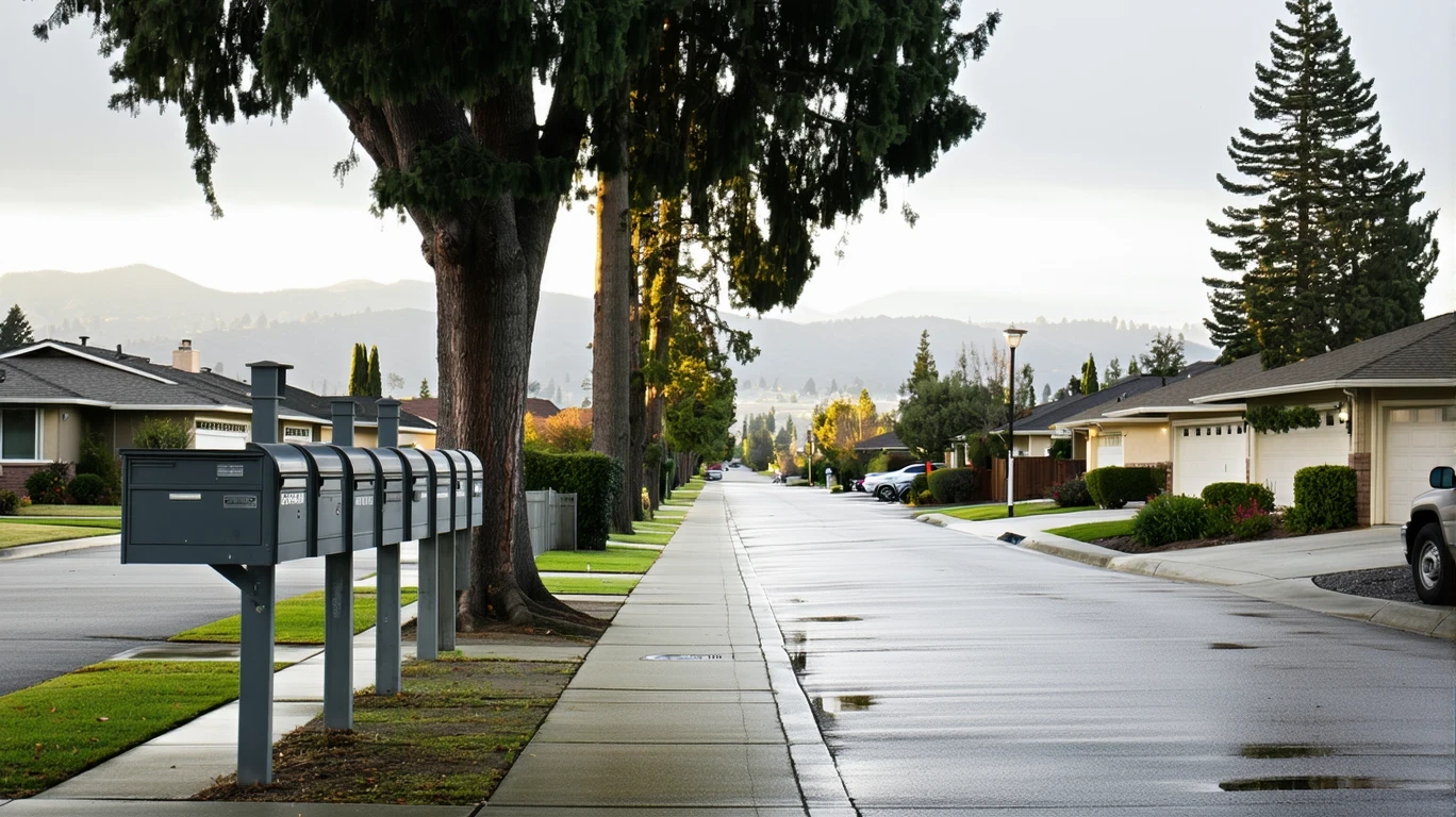 A curved sidewalk in a suburban neighborhood in Campbell, California with mailboxes and wet pavement on a cloudy day.