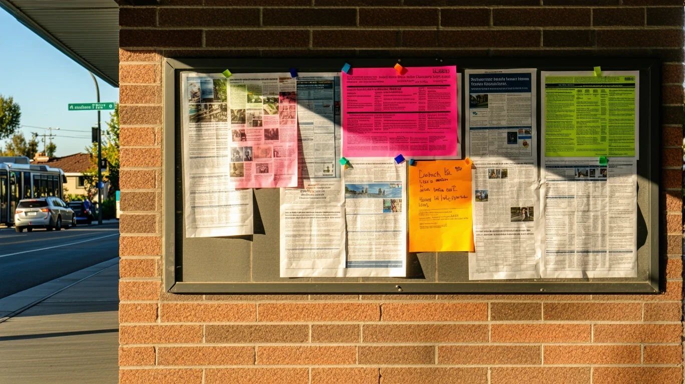 Community board at a Campbell transit hub with bus info and local flyers.