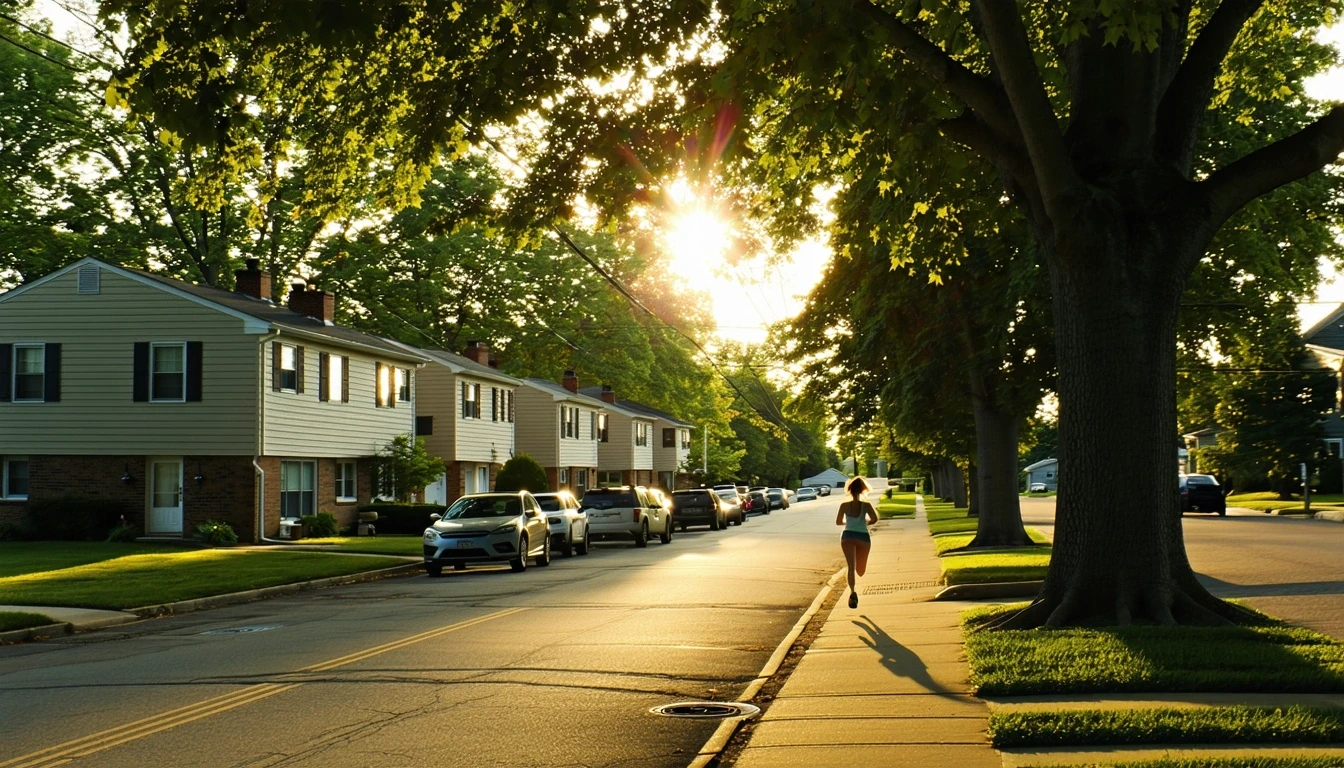 A suburban street in Canton, Michigan at sunrise with modest ranch homes and tree-lined sidewalks.