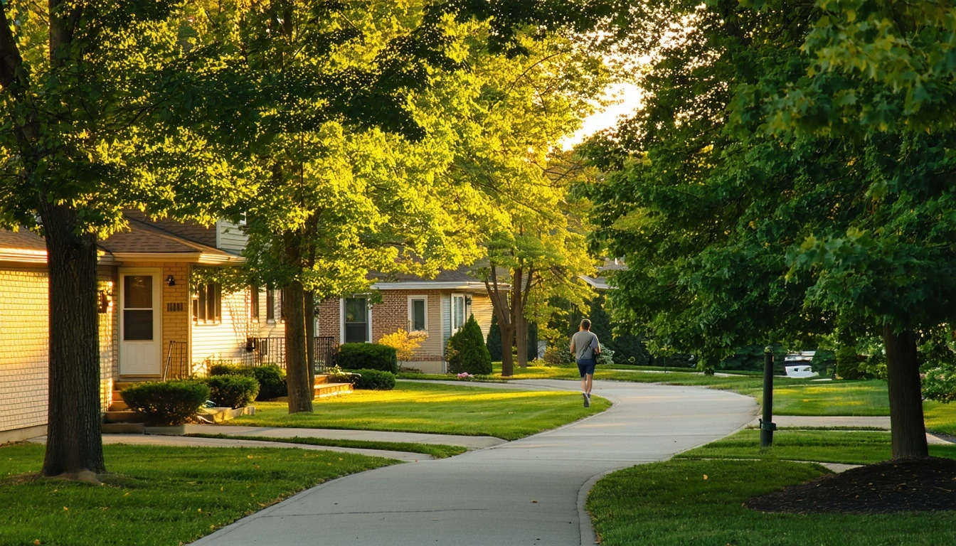 Tree-lined residential street in Canton, Michigan with a person walking on the sidewalk.