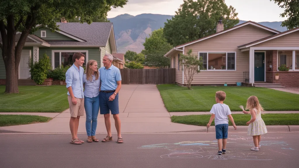 Neighbors chatting while children play in a driveway between suburban homes in Centennial, Colorado.