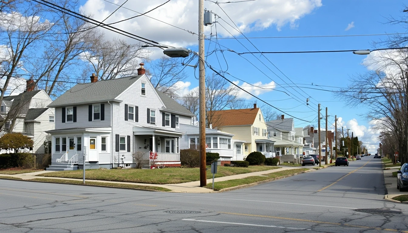 A residential street corner in Cherry Hill, New Jersey with modest single-family homes, parked cars, patchy lawns, and utility lines on a partly cloudy day.