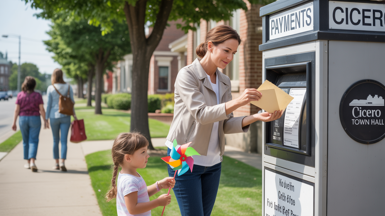 Woman mailing utility payment at outdoor kiosk in Cicero, Illinois with daughter waiting nearby