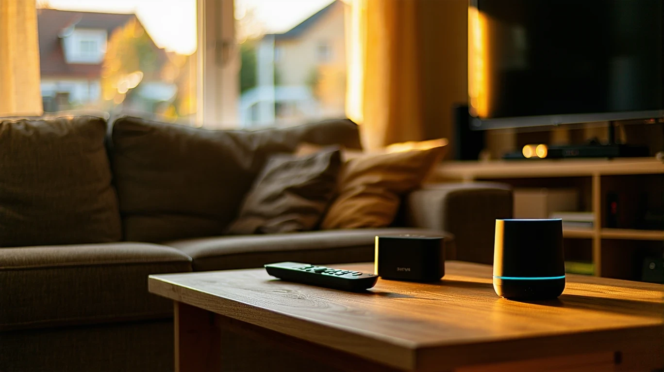 A couch-side table with streaming remotes and a smart speaker, lit by a warm lamp in a cozy living room.