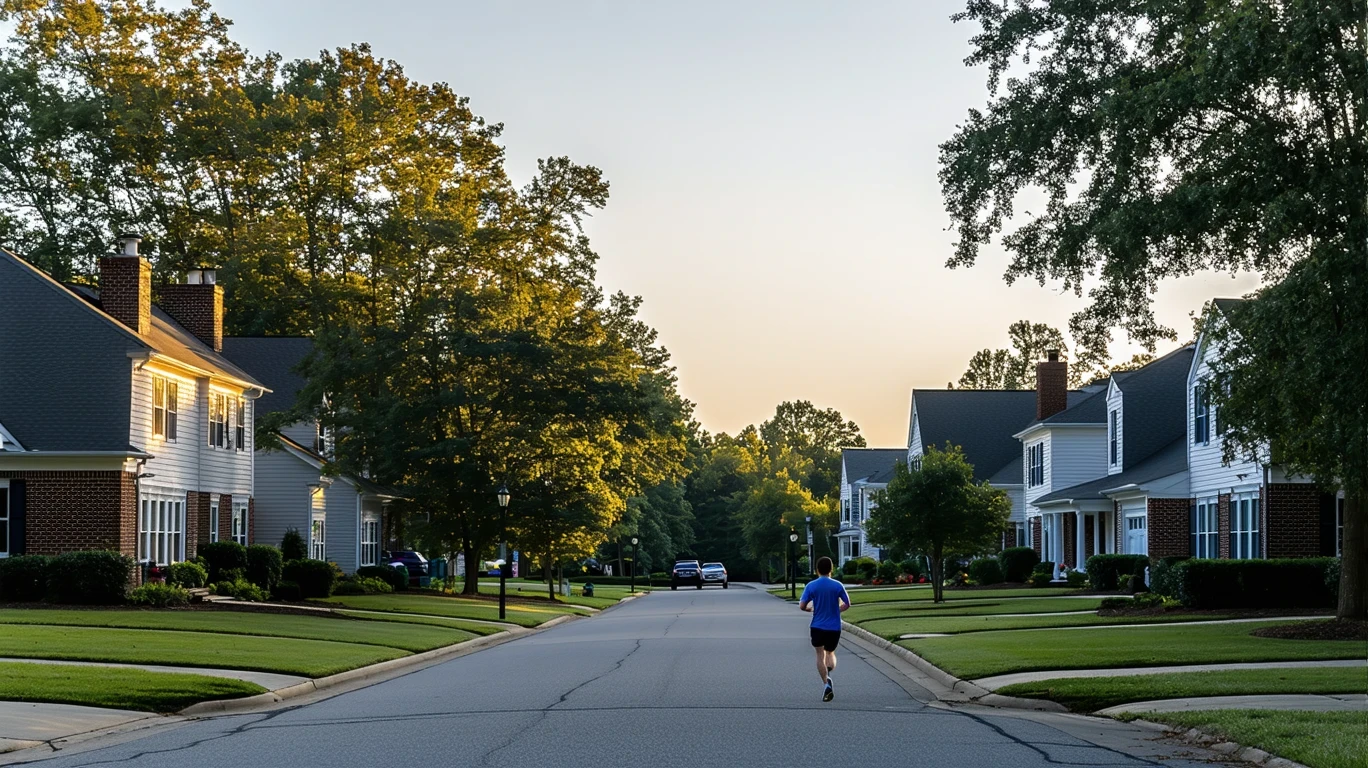 A peaceful residential street in Clayton, NC at sunrise, with modest homes, leafy trees, and a jogger on the sidewalk.