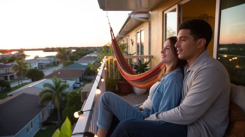 Couple relaxing on their cozy apartment balcony in Clermont, FL at sunset