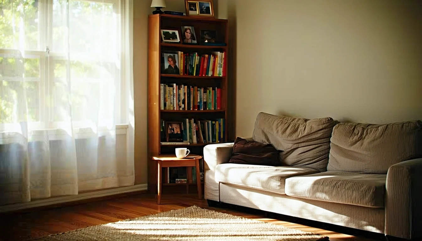 Sunlight through curtains in a small living room with couch and bookshelf in Concord, NC