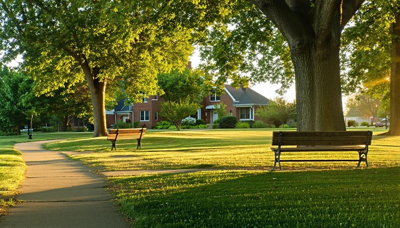 Empty park benches under oak trees at golden hour in Fairview Heights Illinois