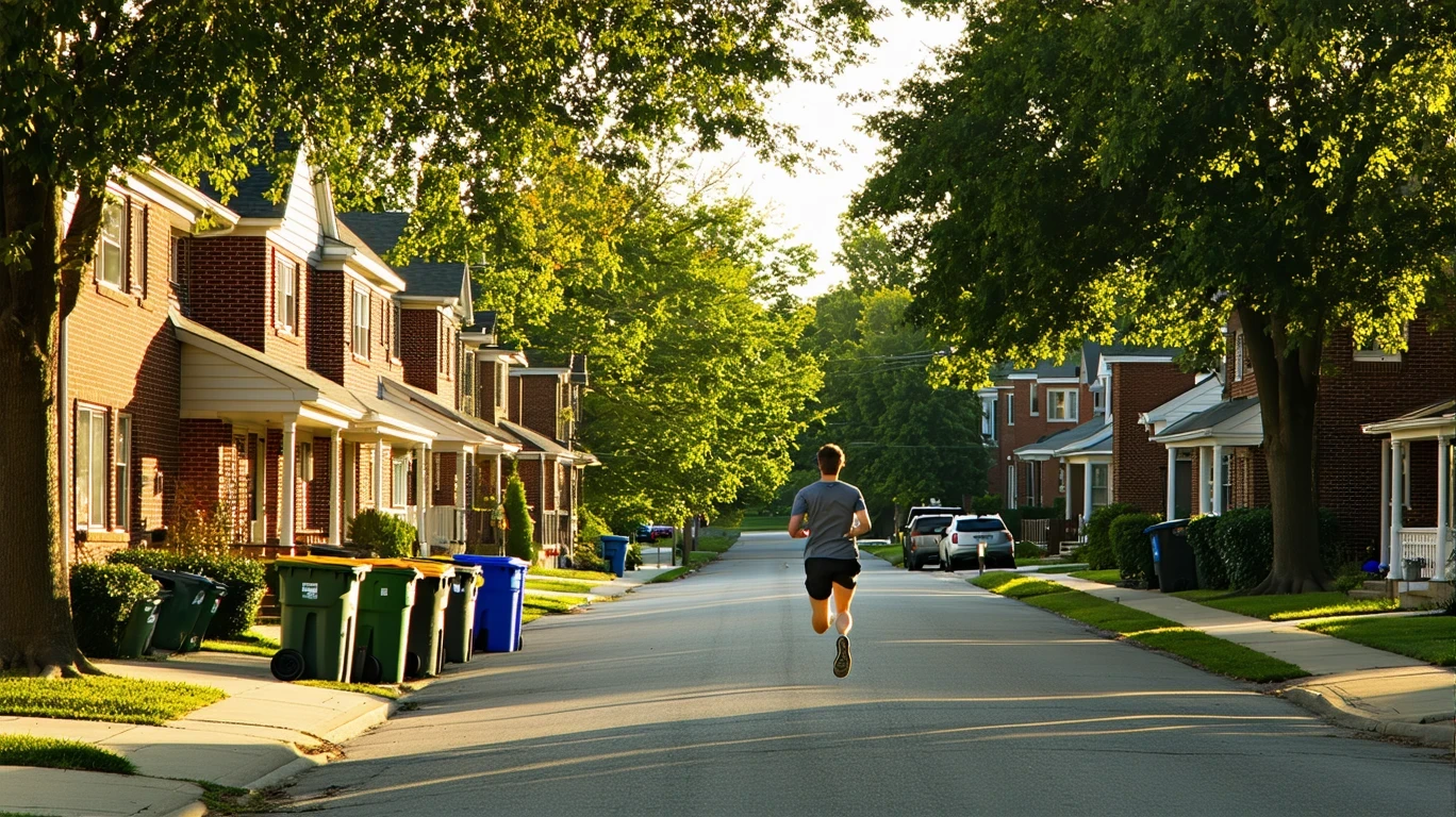 A suburban street in Covington, Kentucky lined with red-brick homes and recycling bins out for pickup. A jogger runs past.