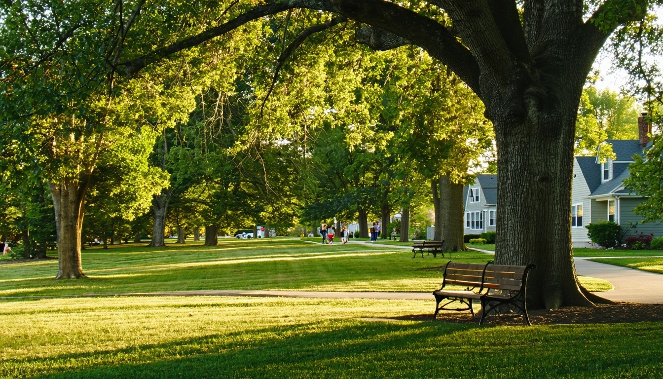 A tranquil park lawn shaded by oak trees, with benches and a walking path, in Dearborn, Michigan on a warm afternoon.