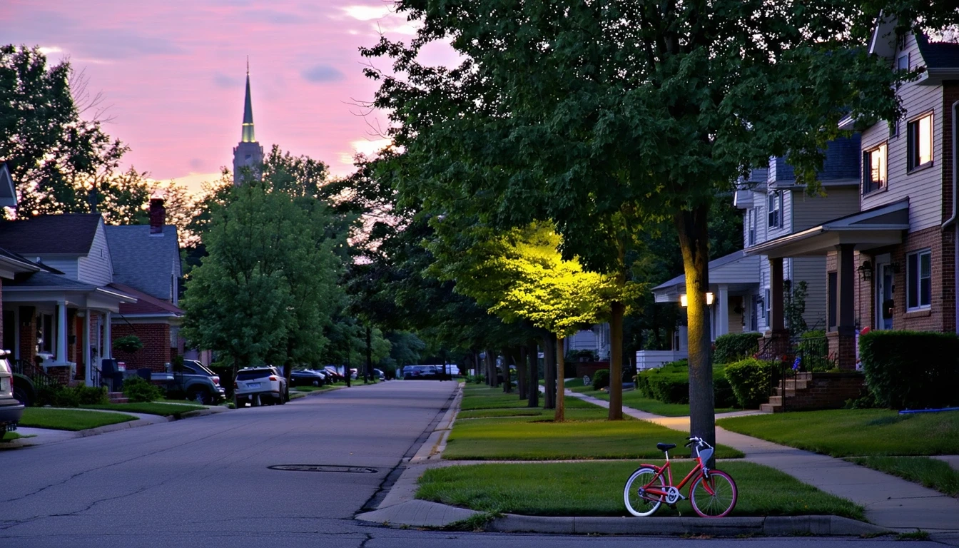 A quiet suburban cul-de-sac in Dearborn, Michigan at dusk, with porch lights illuminating the homes and a child's bicycle near the curb.