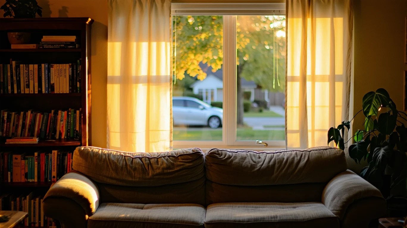A cozy living room in a Del City home, with soft light coming through curtains and illuminating a couch and bookshelf.