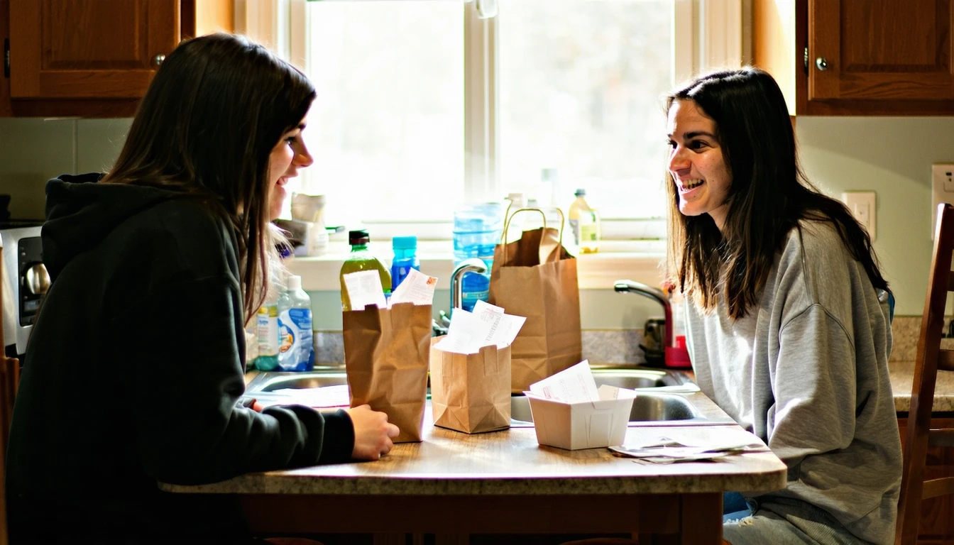 Two roommates discussing finances over takeout in a small apartment kitchen.