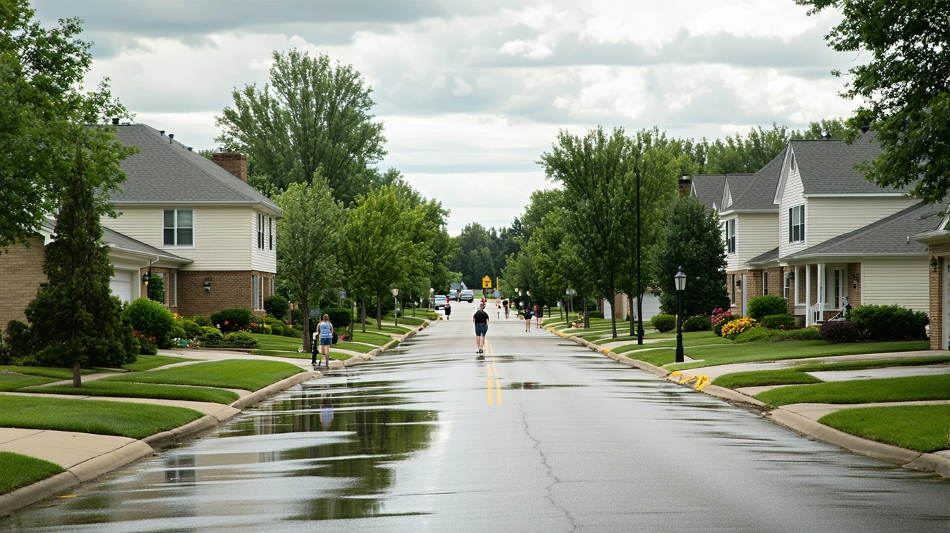 A suburban street in Des Plaines, Illinois after a rain shower, with wet asphalt, palm tree reflections in puddles, and people walking in the distance.