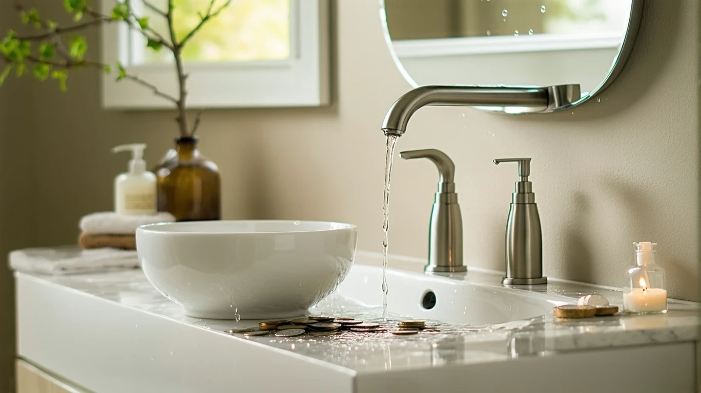 A slow drip from a bathroom faucet falling into a ceramic bowl holding a few coins.