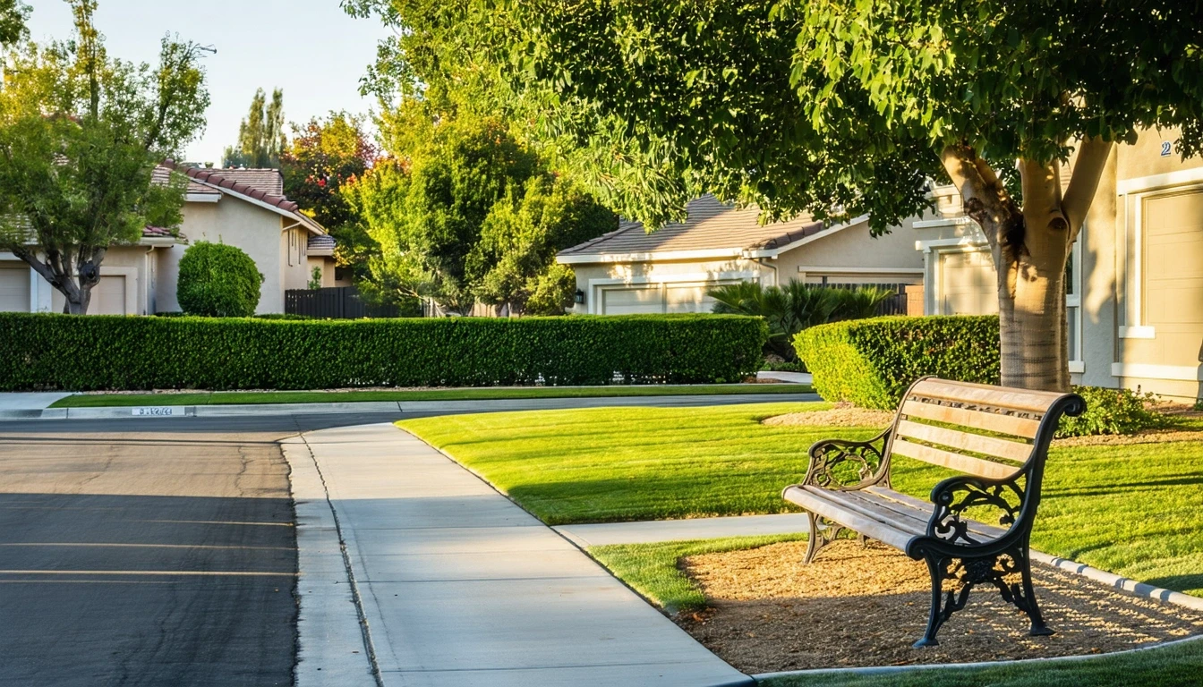 Grassy neighborhood park in Eastvale with bench and trimmed hedges viewed from across the street