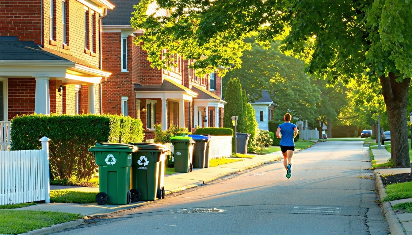 Jogger passing red-brick homes on tree-lined Edwardsville street with bins at curb