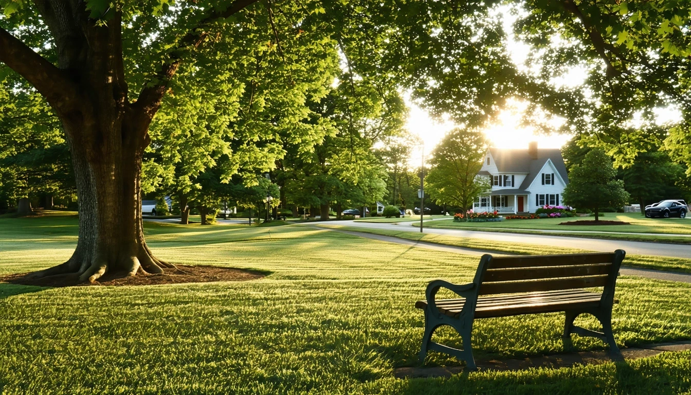 A peaceful park in Enfield, Connecticut with benches under oak trees and sunlight on the grass, walking path in foreground, houses visible in background.