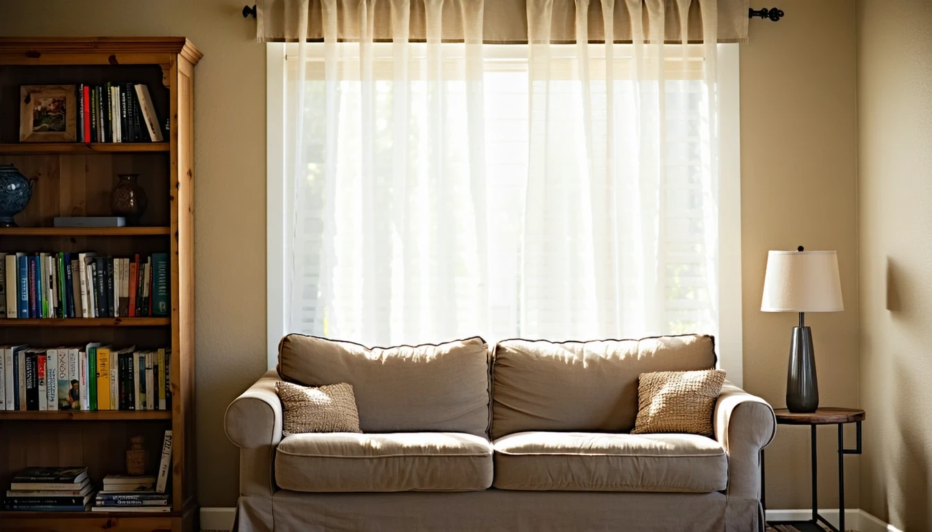 Soft light through curtains in a suburban living room with couch and bookshelf in Enterprise, NV