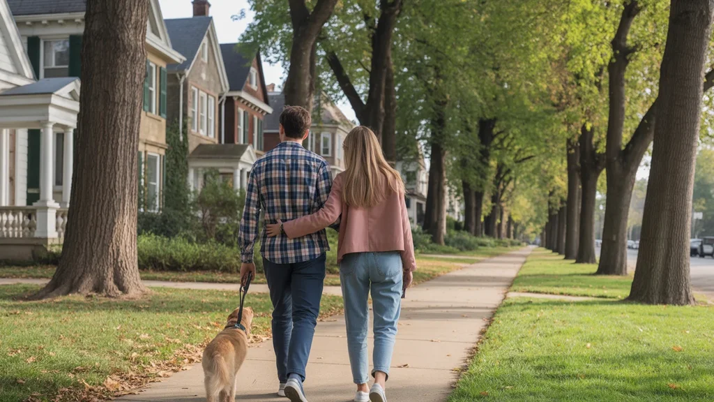 Couple walking dog in residential Evanston neighborhood with historic houses and fall foliage.