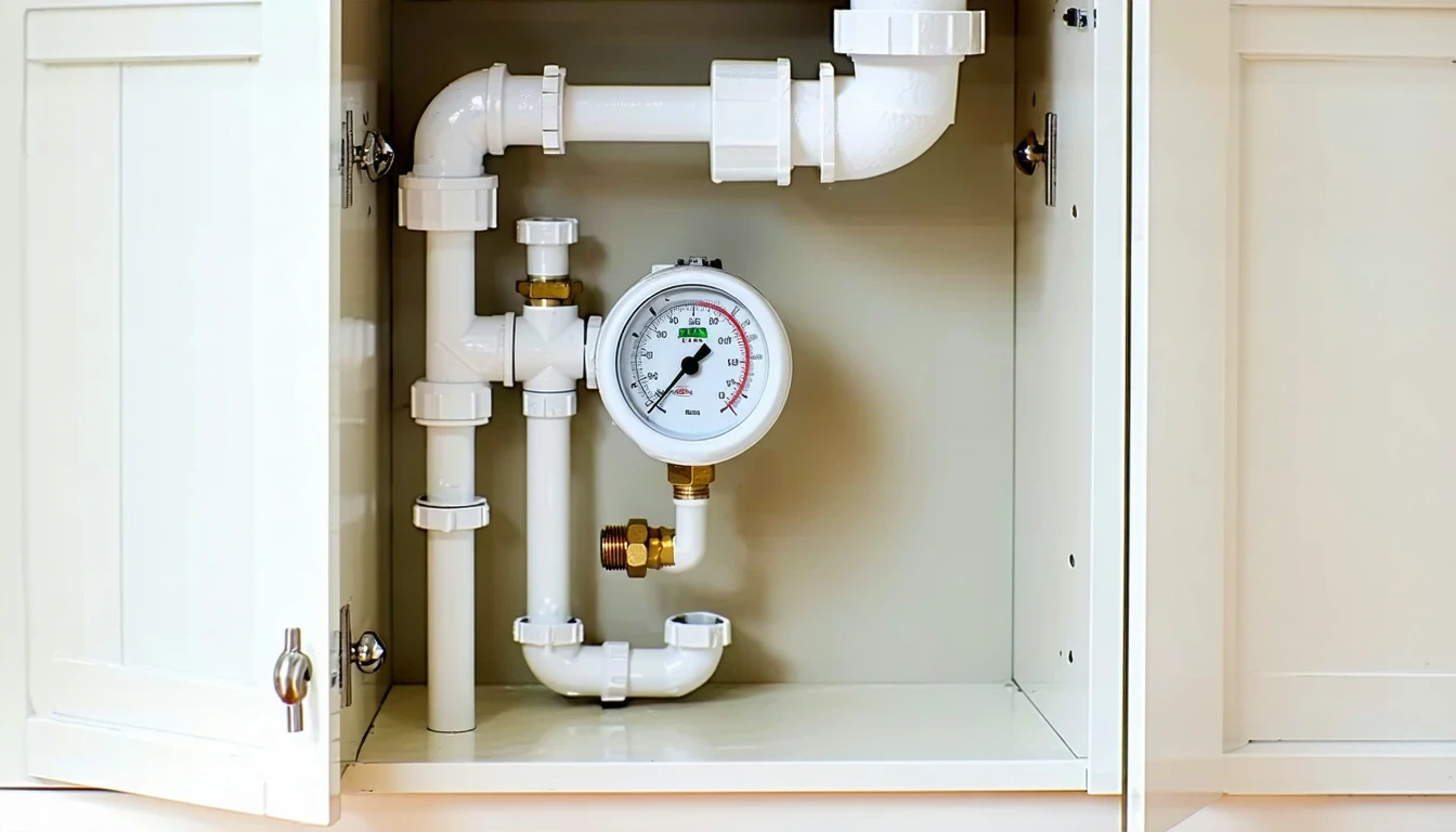 Under-sink water meter and PVC piping in a Fairview Heights home cabinet