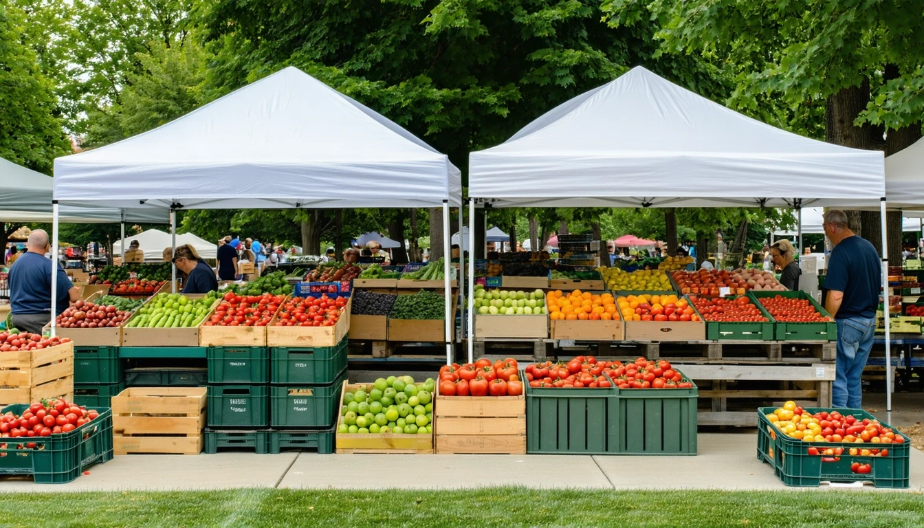 A suburban farmer's market in Farmington Hills, MI at opening hour with vendors arranging produce under canvas awnings.